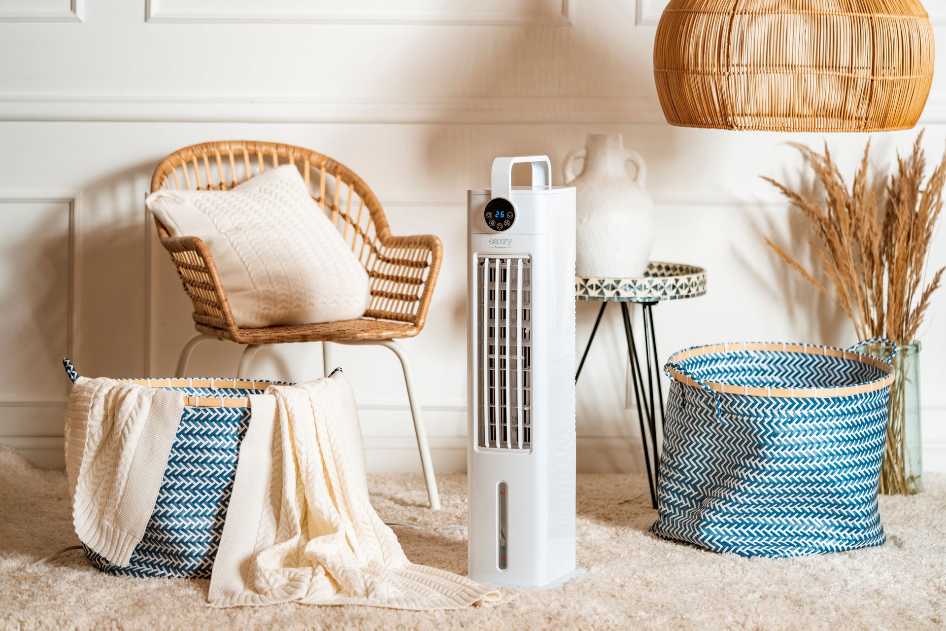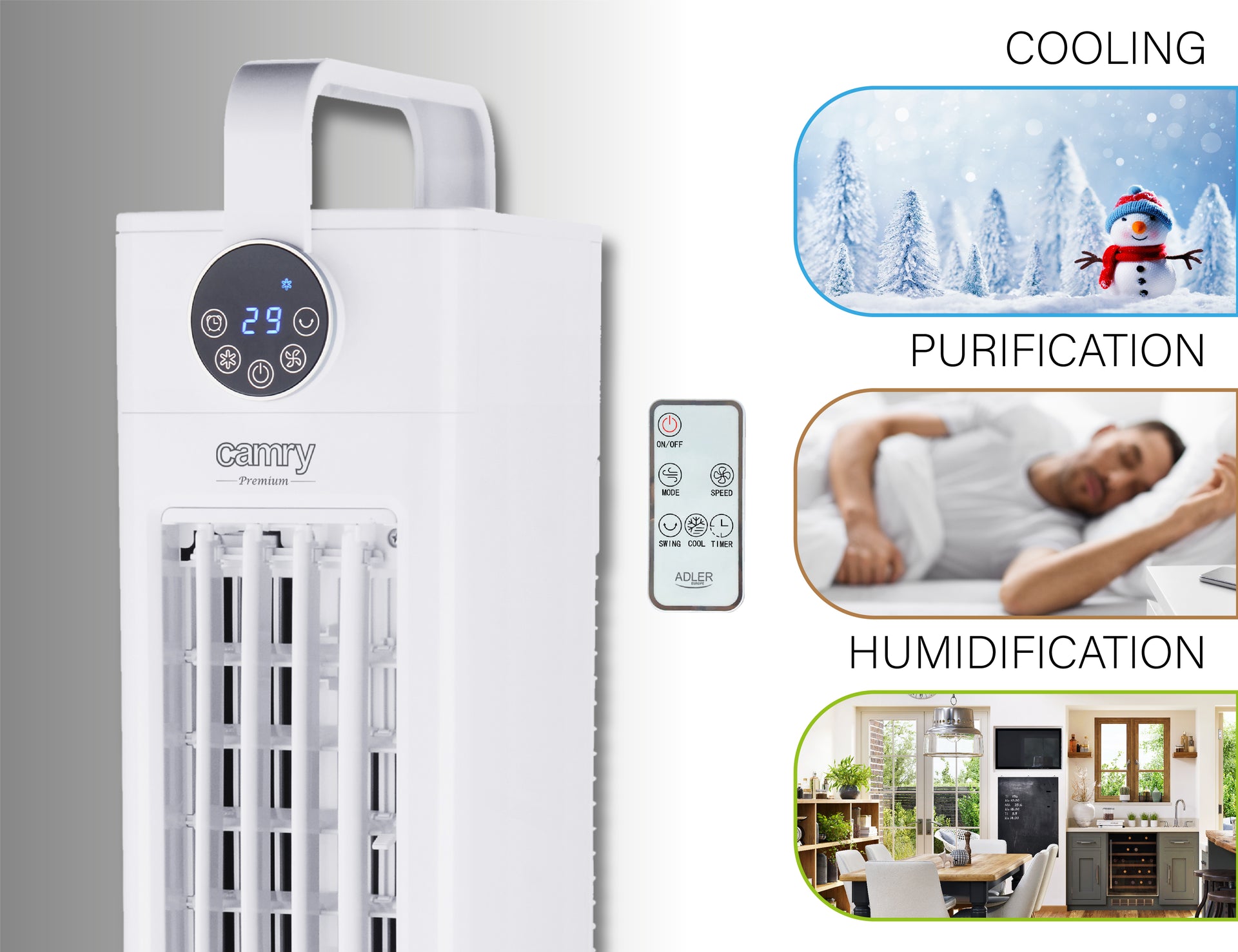 This 3-in-1 column air conditioner combines cooling, humidification, and air purification in a single device, making it a versatile addition to various indoor spaces. It features three fan speeds, an LCD touch panel, and a remote control for easy operation.