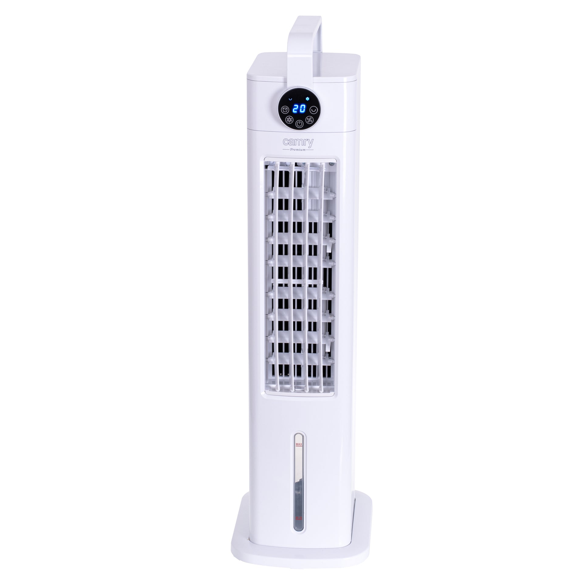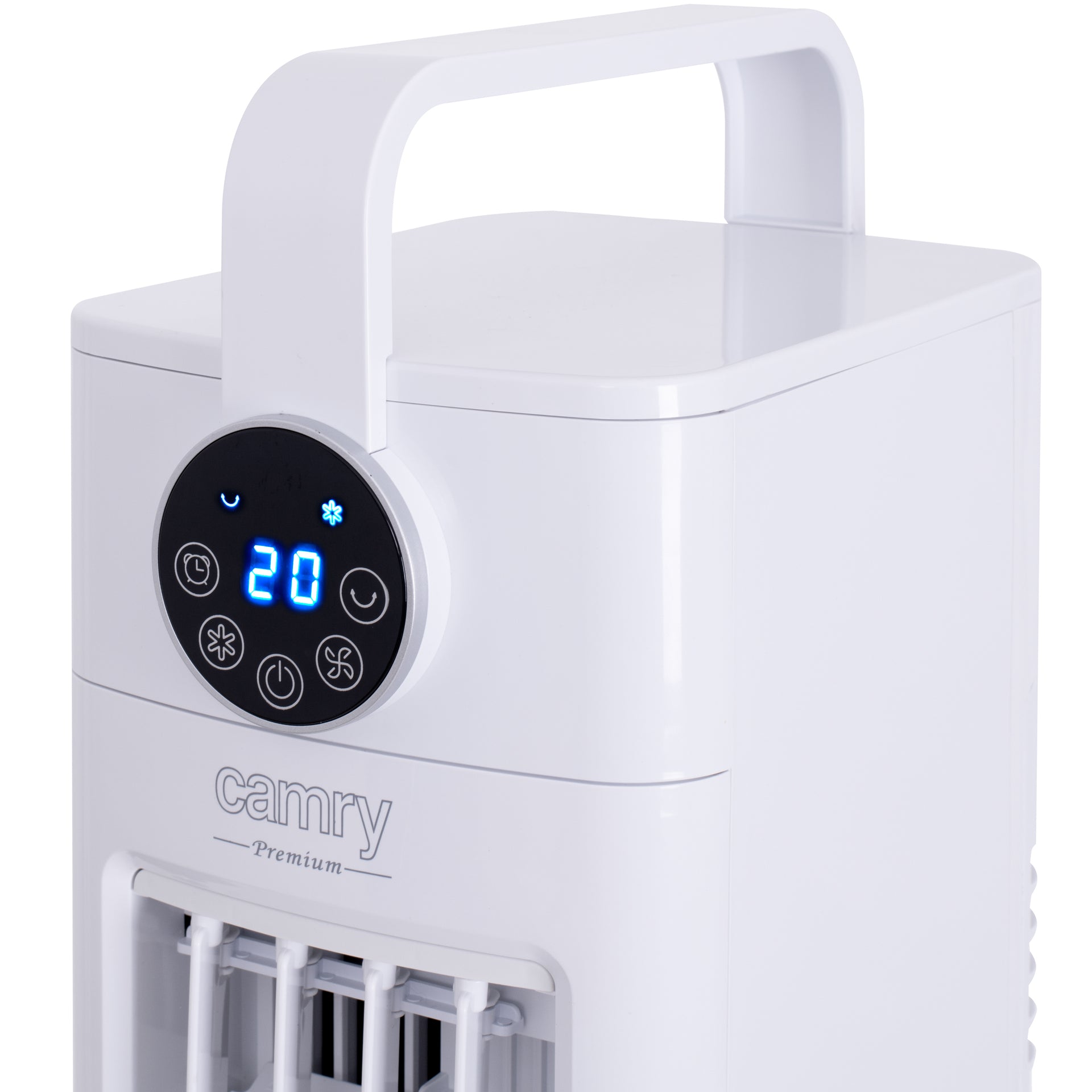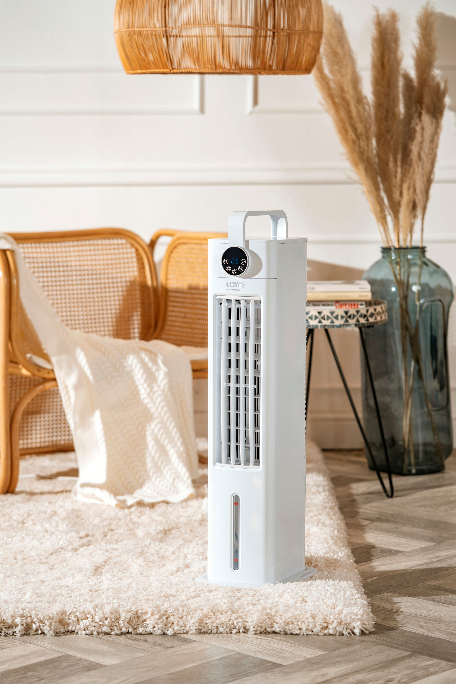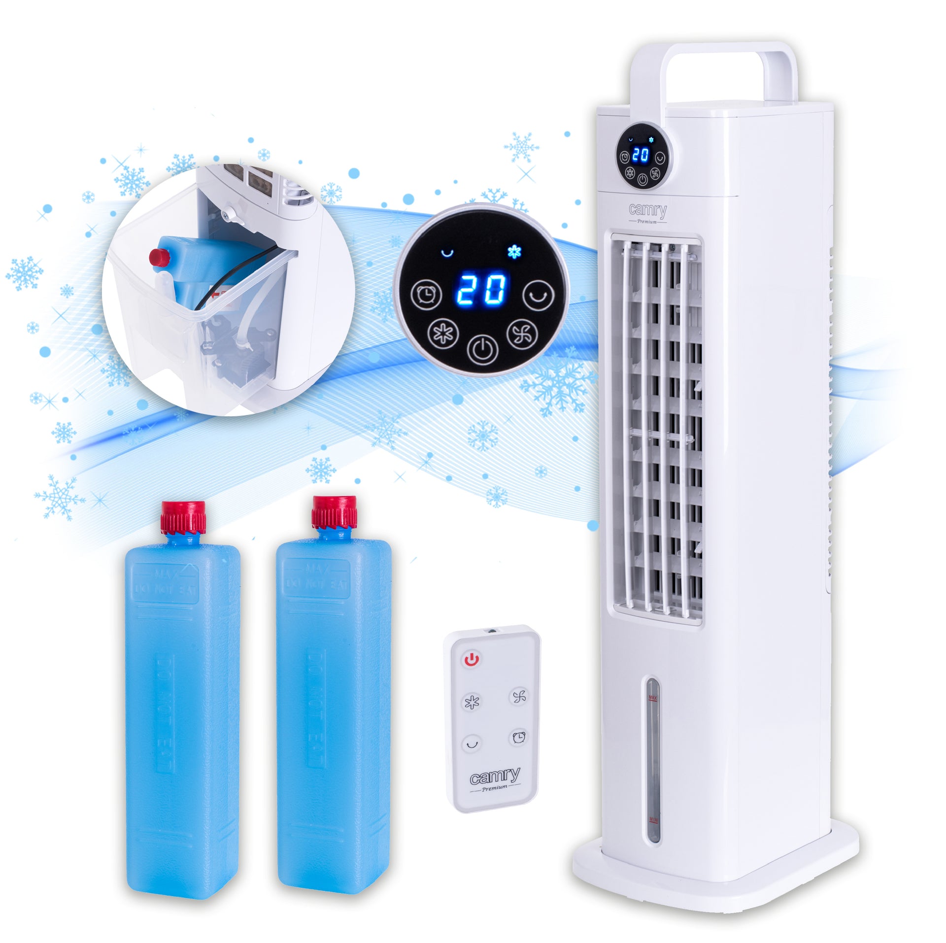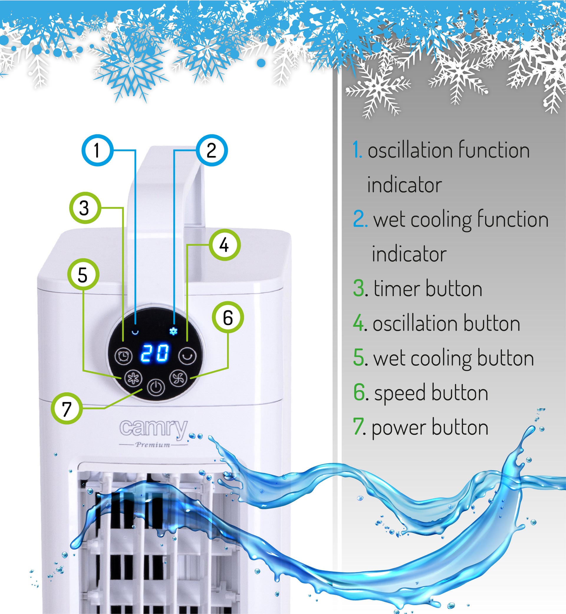 The cooling function works with a water pump and two included gel containers that can be frozen and placed in the 3.5L water tank for enhanced cooling and humidification. The device also includes a timer that can be set between 1 and 12 hours, and 52° horizontal oscillation for even air distribution.