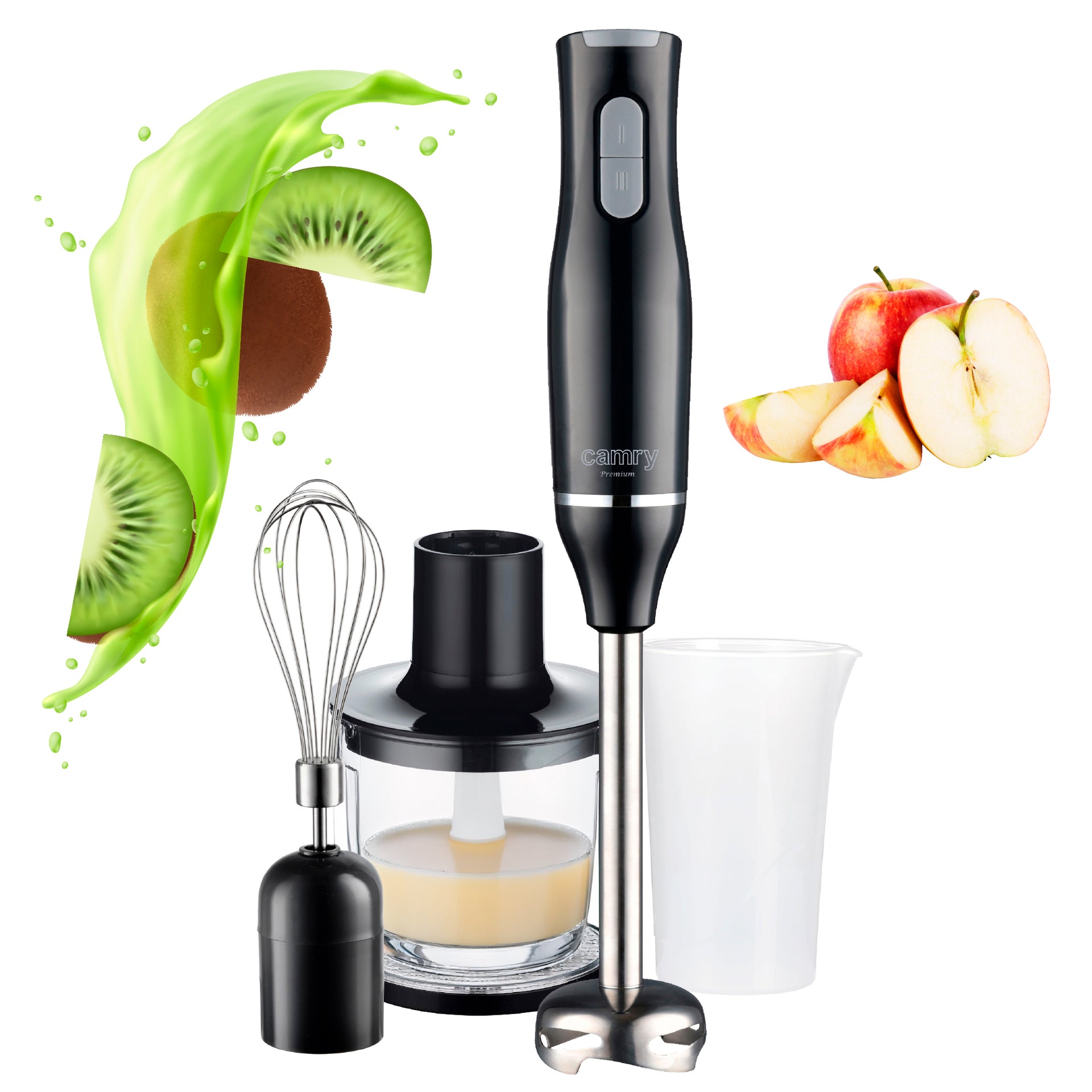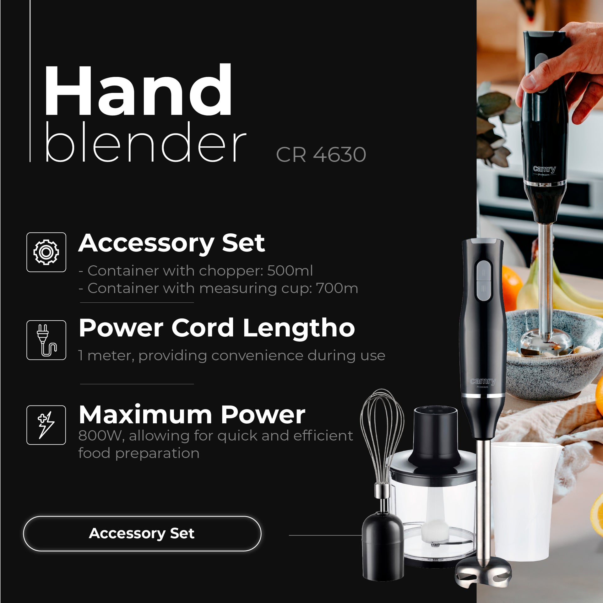 The Camry CR 4630 hand blender offers practical features for preparing a variety of dishes at home. It comes with durable stainless steel blades and several accessories that allow blending, chopping, and whisking with ease.