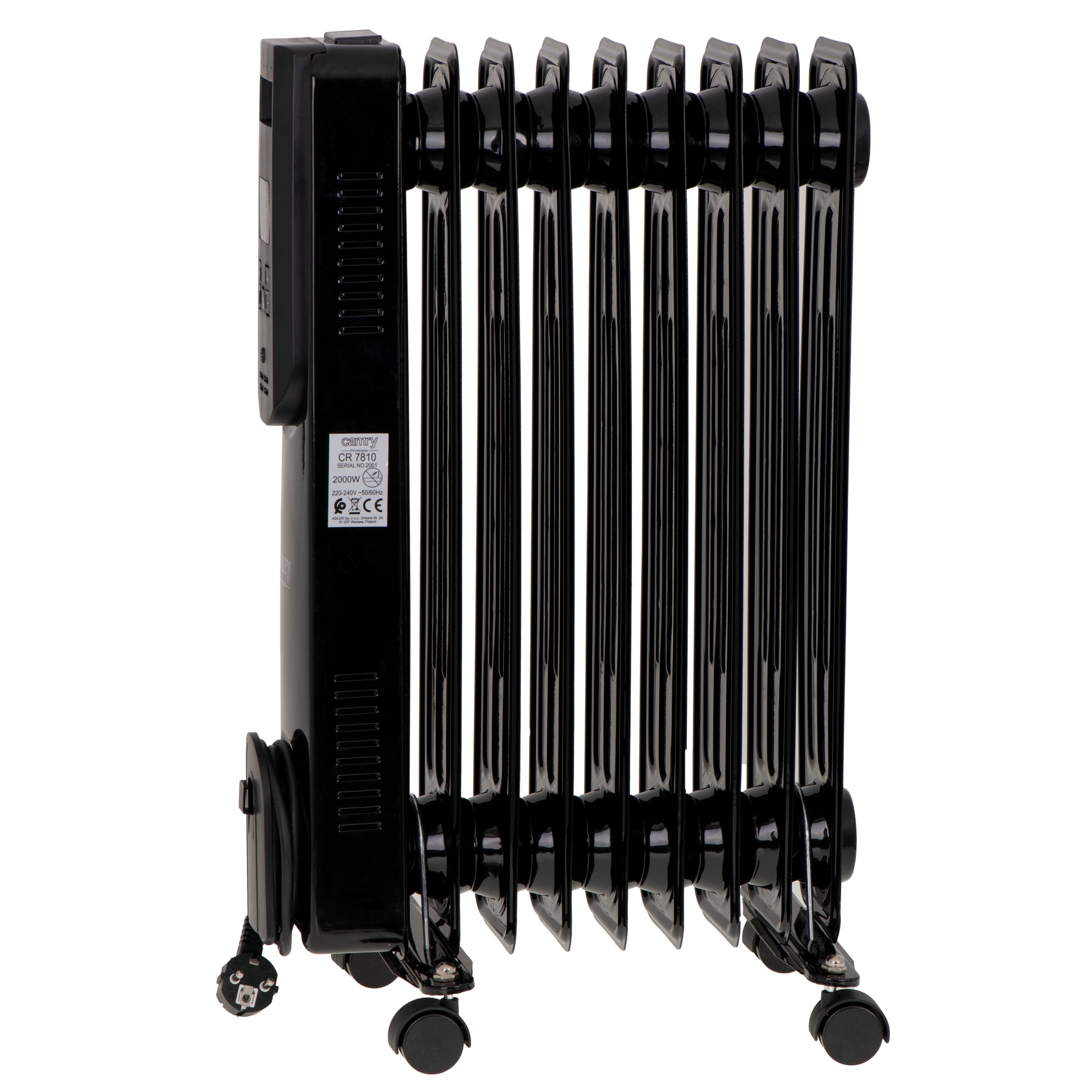 The Camry CR 7810 oil-filled radiator provides efficient heating for rooms where additional warmth is needed. It features 9 heating fins and three power levels (800W, 1200W, 2000W) with an adjustable temperature range from 15°C to 35°C. The radiator automatically adjusts power consumption to maintain the selected temperature.